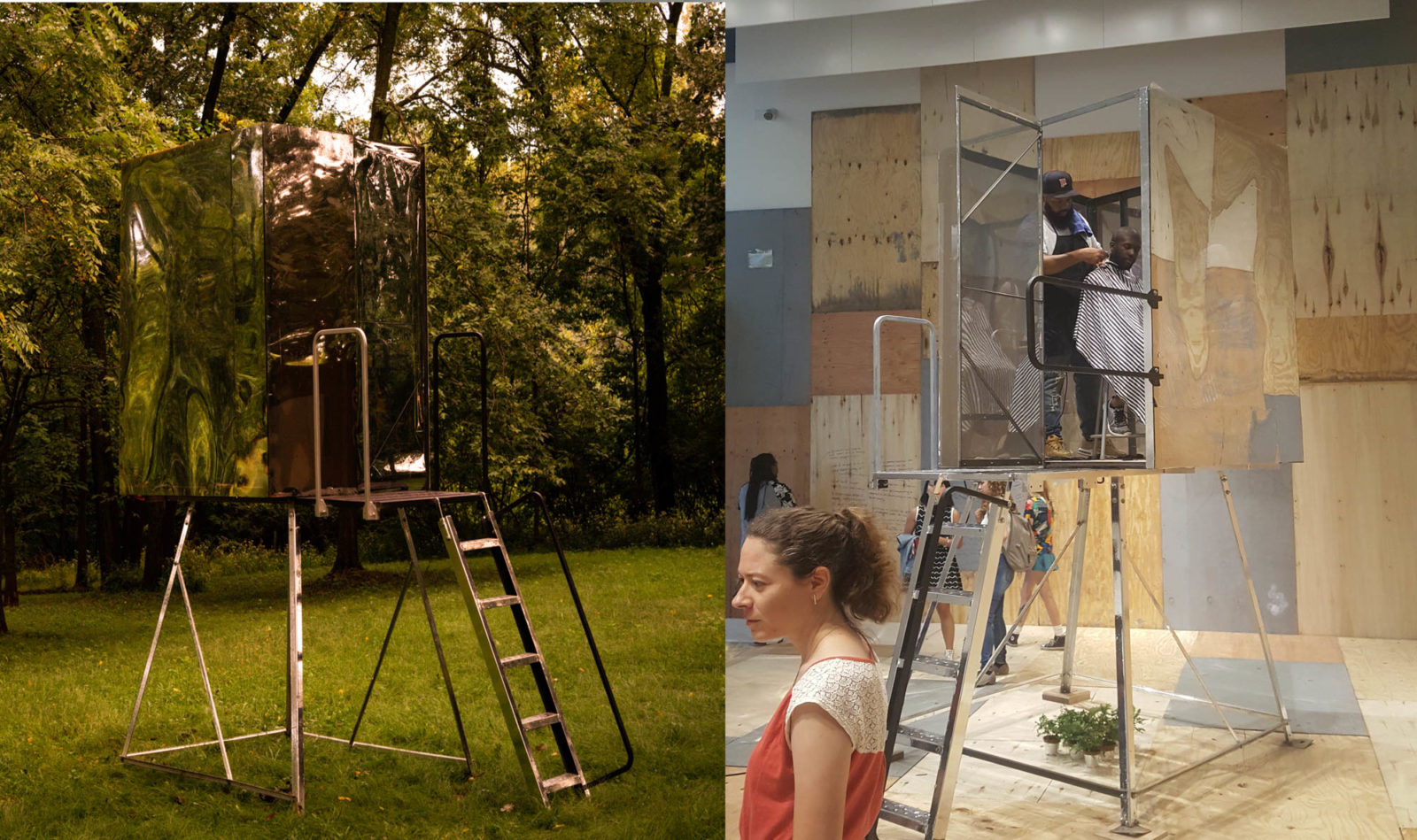Photo of kNOw Space at J Gallery, a portable zendo that provides participants with empowering tools to build resilience into self and community, while providing private safe spaces within oppressive constructs to reflect or decompress in natural settings.